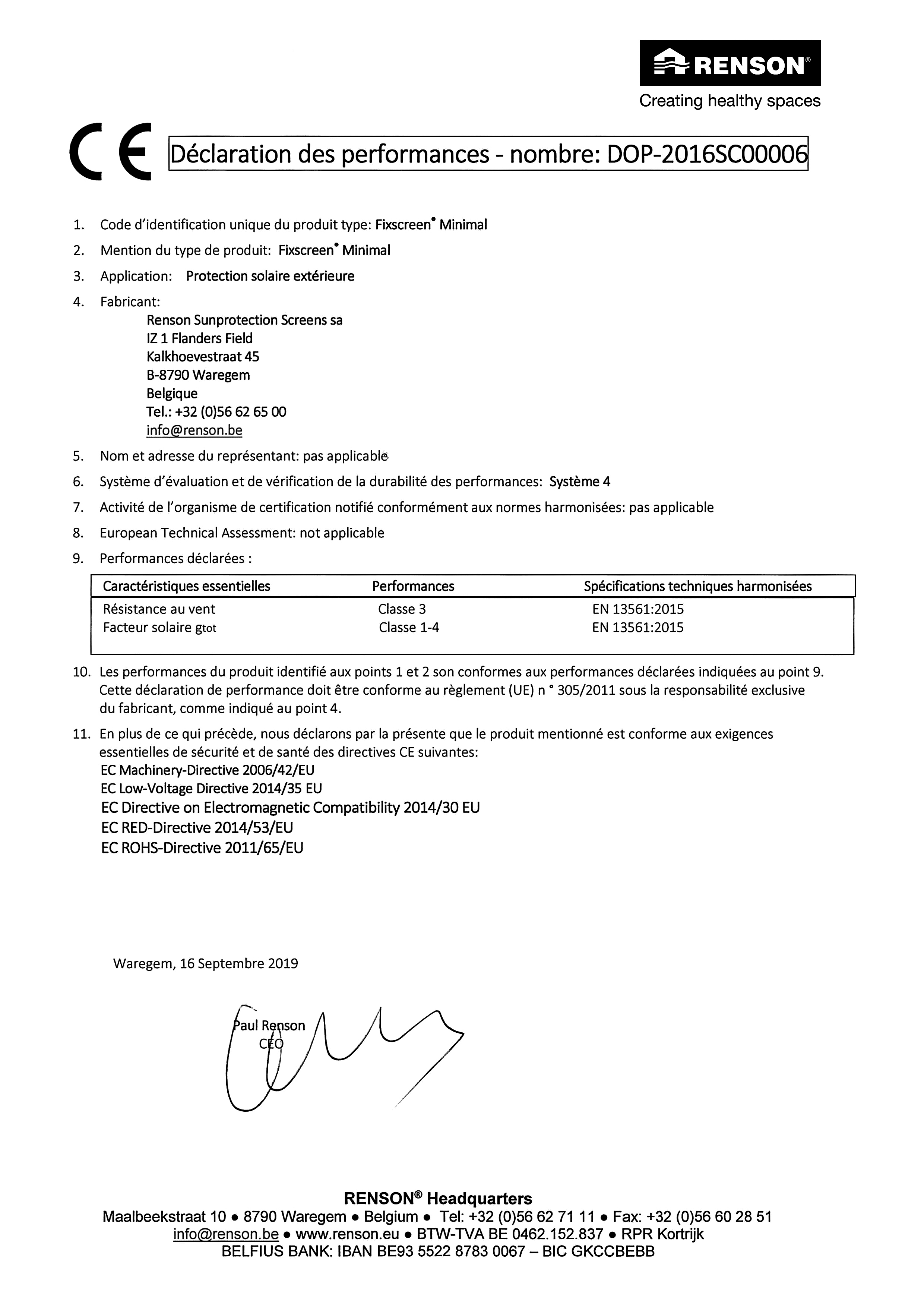 En tant que pionnier dans le domaine des stores de protection solaire résistants au vent jusqu’à 130 km/h, Renson® place la barre encore plus haut avec le Fixscreen Minimal. Le but ultime étant de rendre le moins visibles possible le caisson et les coulisses lors d’une rénovation ou d’une pose ultérieure. C’est pourquoi chaque composant, chaque détail du store de protection solaire est minutieusement contrôlé : caisson, coulisses, tube d’enroulement, dimensions, tension de la toile... Avec comme résultat : des