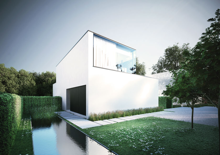 Deze strakke, moderne woning valt op door z’n pure kleurencombinatie van wit (het pleisterwerk) en zwart buitenschrijnwerk. De gevelbekleding sluit naadloos aan bij dat laatste. “De keuze voor aluminium voor zowel dat buitenschrijnwerk als de gevelbekleding stond van in het begin vast,” herinnert zich Lynn Blancquaert (ABS Bouwteam), “enerzijds voor de strakke look maar minstens evenzeer omwille van de onderhoudsvriendelijkheid van het materiaal.”